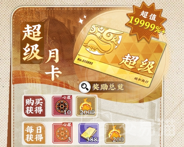 超级月卡售价68元,开通即得10【心愿胶片盘】;后续每日提供3【心愿胶片盘】、388【金砖】与200【武魂】(用于武将升阶),同时开放【每日金砖挂机次数 1】与【武道会助威奖励自动领取】两项功能。全周期累计可获100【心愿胶片盘】、11640【金砖】及8000【武魂】。