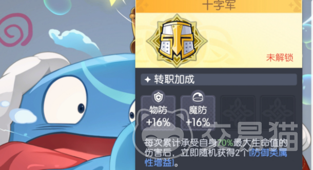 十字军:属于均衡型抗压向转职,适用于多数无特殊功能倾向的坦克角色。提供16%物理防御与16%魔法防御双重增益;每累计承受伤害达自身70%最大生命值后,自动激活两项防御强化效果。该被动机制使坦克在战斗中越战越稳,通过阶段性承伤积累防御成长,构建扎实的持续承伤基础。在缺乏明确战术侧重或阵容需求不突出的情况下,十字军是最稳妥、兼容性最强的通用选择。