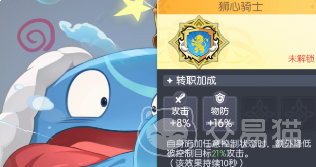 狮心骑士:专为具备控制技能的坦克设计,典型适配角色包括史莱姆国王、海尔曼等。转职后获得8%攻击力加成与16%物理防御提升;当自身对敌方施加任何控制效果(如眩晕、沉默、禁锢等)后,目标将额外承受21%攻击降低效果。该减攻效果可随控制技能多次命中叠加,形成持续压制链,有效削弱敌方主力输出强度。需注意:无稳定控制手段的坦克选择此转职将无法激活核心机制,导致资源投入低效。