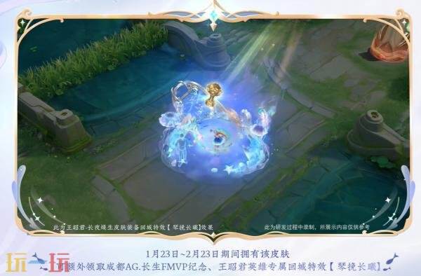 1月23日00:00~2月23日23:59期间,拥有【王昭君-长夜焕生】皮肤可额外领取成都AG.长生FMVP纪念、王昭君英雄专属回城特效【琴挽长曦】。
