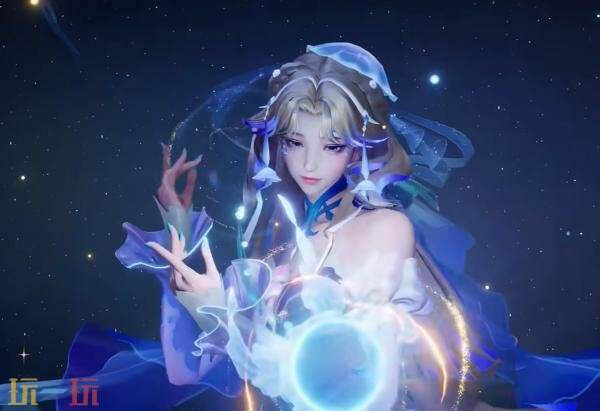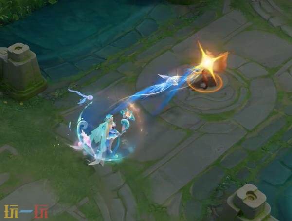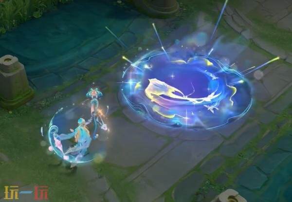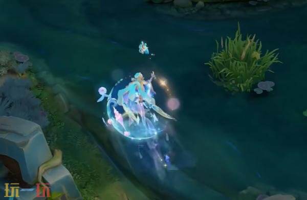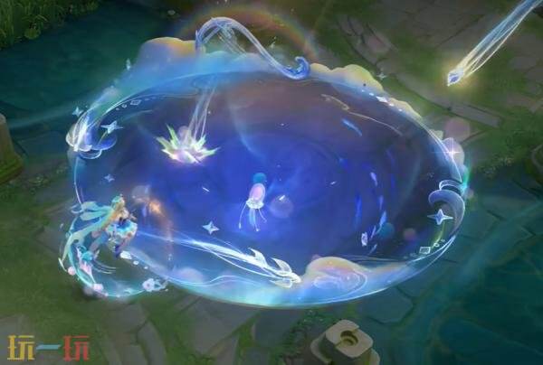 三技能:王昭君召唤出一片梦幻海域,边缘缭绕被晨光浸染的金色云朵;云朵间浮现水母竖琴,琴弦自动奏响,召唤两只飞鱼环绕海域遨游;随后鲸鱼幻影从海域中腾空跃起,其间贝壳、海螺与记忆碎片不断洒落;每一碎片击中地面时,都会唤醒一只发光的小灯塔水母,在海域内轻盈浮动。