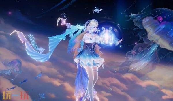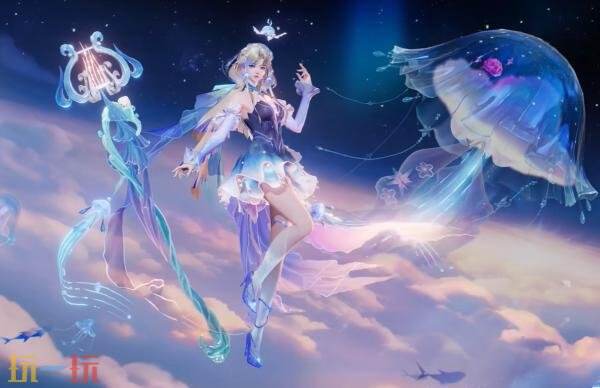 整体以“记忆苏醒与深海奇观”为核心,配色上以蔚蓝色为主,橙黄色为辅,将灯塔水母、发光海洋生物与阳光照耀过的云朵融入技能特效。技能释放时有鳐鱼盘旋、鲸鱼跃起等动态场面,大招更以竖琴召唤浩瀚水母群,营造出唯美而梦幻的视觉效果。