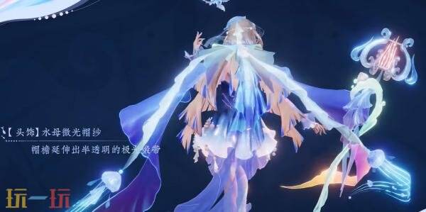 配饰设计:头戴水母造型的微光帽纱,帽檐延伸出半透明的极光缎带,充满轻灵通透感;末端衔接水母造型的优美下摆,搭配头顶的水母小吊饰,如同小精灵在身旁环绕游弋。