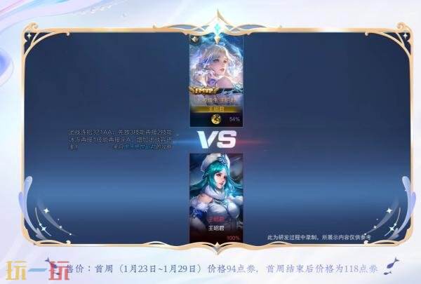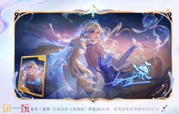 【王昭君-长夜焕生】为传说品质皮肤,标签为“FMVP”,将于2026年1月23日0点上架商城,其中2026年1月23日00:00~1月29日23:59首周价格为1350点券,同时,拥有王昭君英雄可得388专属优惠券,首周活动专属价格为962点券,首周结束后价格为1688点券。
