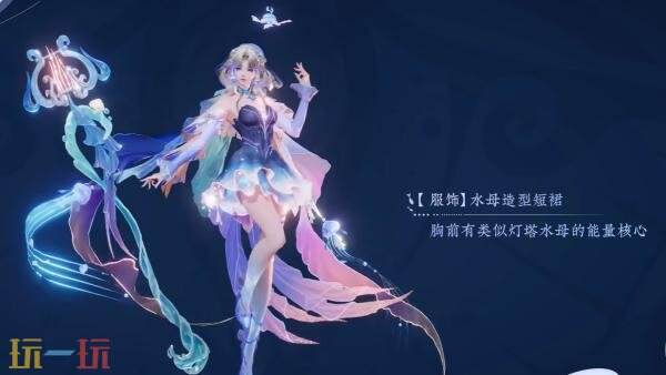 服饰设计:上衣的胸前有类似灯塔水母的红色能量核心,红色也正是成都AG超玩会的应援色。短裙与下摆构成完整的水母形态,裙摆上还流动着波光粼粼的海浪波纹;腿部为精灵般的微透光肢体,当环境变暗时,会浮现出如蓝眼泪般的幽幽荧光,充满动态幻想感。