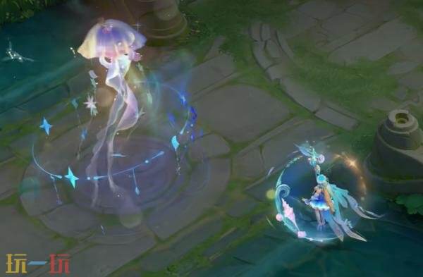 被动技能:护盾打破后,蓝金色海韵荡开化作云朵和海螺四散,似深海轻吟。