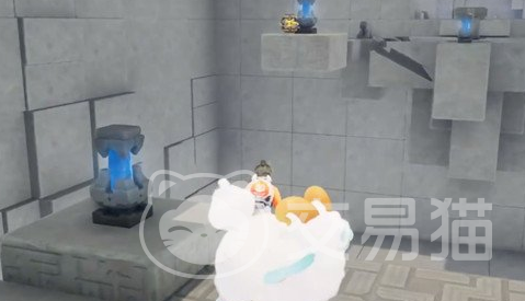 腾云驾雾地宫是全图隐藏宝箱密度最高的区域之一,多数宝箱需通过环境互动或机关解谜触发。首处宝箱位于主入口附近:靠近区域起点后,可见一个紫色电箱,将其向左推动,使其精准嵌入左侧断开的电路接口。通电后,前方封闭门自动开启,宝箱即显露于门后开阔空间**。