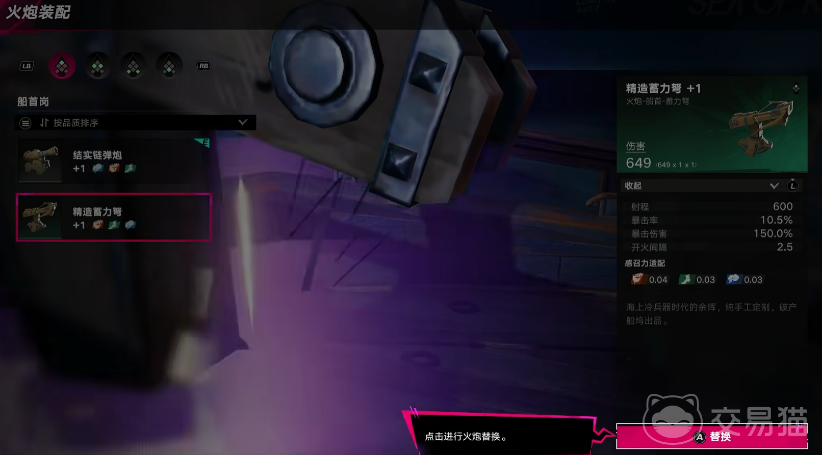 精造蓄力弩可通过完成特定航海任务获得——当玩家在海上遭遇敌对舰船并成功击毁目标后,系统将自动发放该武器作为战利品。装配流程清晰:进入船只管理界面,点击“上甲板”选项,在四组火炮位中选定船首位置,点击“替换”,即可完成安装。