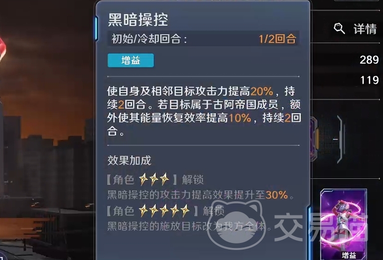 她的两个主动技能分别承担团队增益与精准压制功能。技能“黑暗操控”作用于自身及左右相邻单位,提供20%攻击力加成;若目标为古阿帝国阵营角色,额外赋予10%能量恢复效率提升。另一技能“黑暗掌刃”则针对敌方单体,造成伤害的同时,以60%基础概率施加攻击力降低效果。当亡灵吉娜升至6星后,该减益触发概率提升至100%,确保每次释放均能稳定削弱敌方关键输出单位。