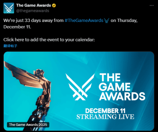 今日,TGA官方在推特上发布了一则提醒帖:“距离TGA2025(当地时间12月11日星期四举行)还有33天,请将活动添加到您的日历中。”