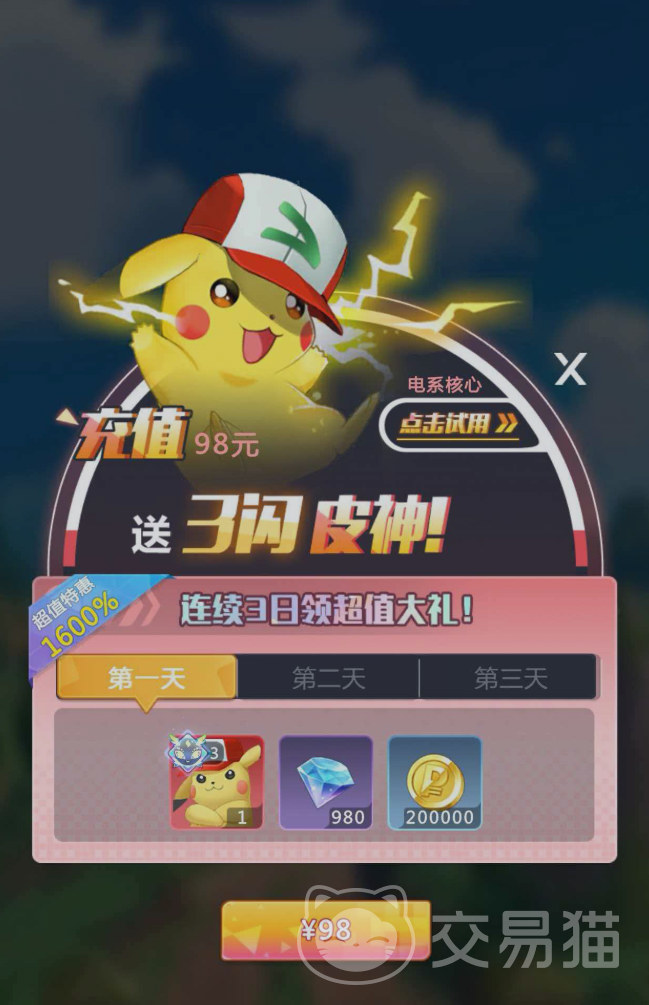 以98元首充档位为例,玩家将直接获得限定闪光皮卡丘,同时额外解锁大量钻石与金币资源。这些核心货币对战力提升具有显著加成作用:钻石可用于抽卡与突破关键精灵,金币则支撑技能升级、装备强化等基础养成环节。据实际数据测算,该档位的整体资源回报率约为16倍,能有效加速阵容成型速度与主线推进效率。