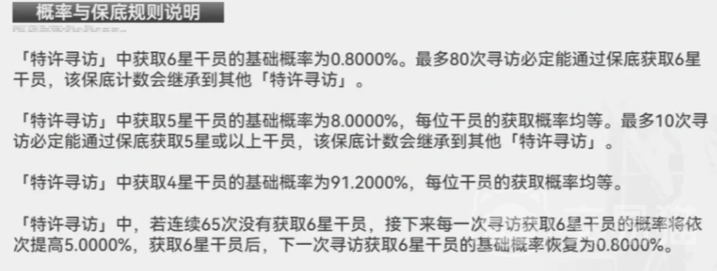 先明确基础换算关系:1源石 = 90合成玉;单次寻访消耗600合成玉。若以人民币计价,10连寻访礼包定价约98元,相比单抽更具性价比。需特别注意的是,当前角色池未设置大小保底机制——六星干员基础出率固定为0.8%,而当期限定六星仅占全部六星产出的50%。常规情况下,80抽大概率触发常驻六星,存在明显“歪卡”风险;真正具备确定性的保底节点为第120抽,即累计寻访达120次后必得当期限定六星干员。