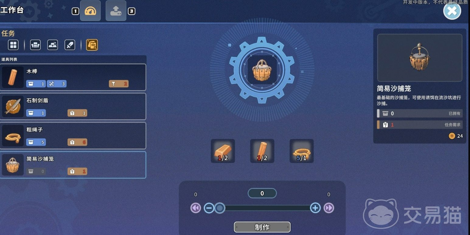 第一步是制作沙捕笼——这是开展所有沙捕活动的前提装备。玩家需前往工作台,在解锁对应配方后,消耗2个铜锭、2根木棒及1条粗绳子进行合成。铜锭可通过矿洞深层挖掘获得;木棒由基础木材加工制成;粗绳子则可在采集或任务奖励中稳定获取。材料齐备后,即可完成沙捕笼的制作。