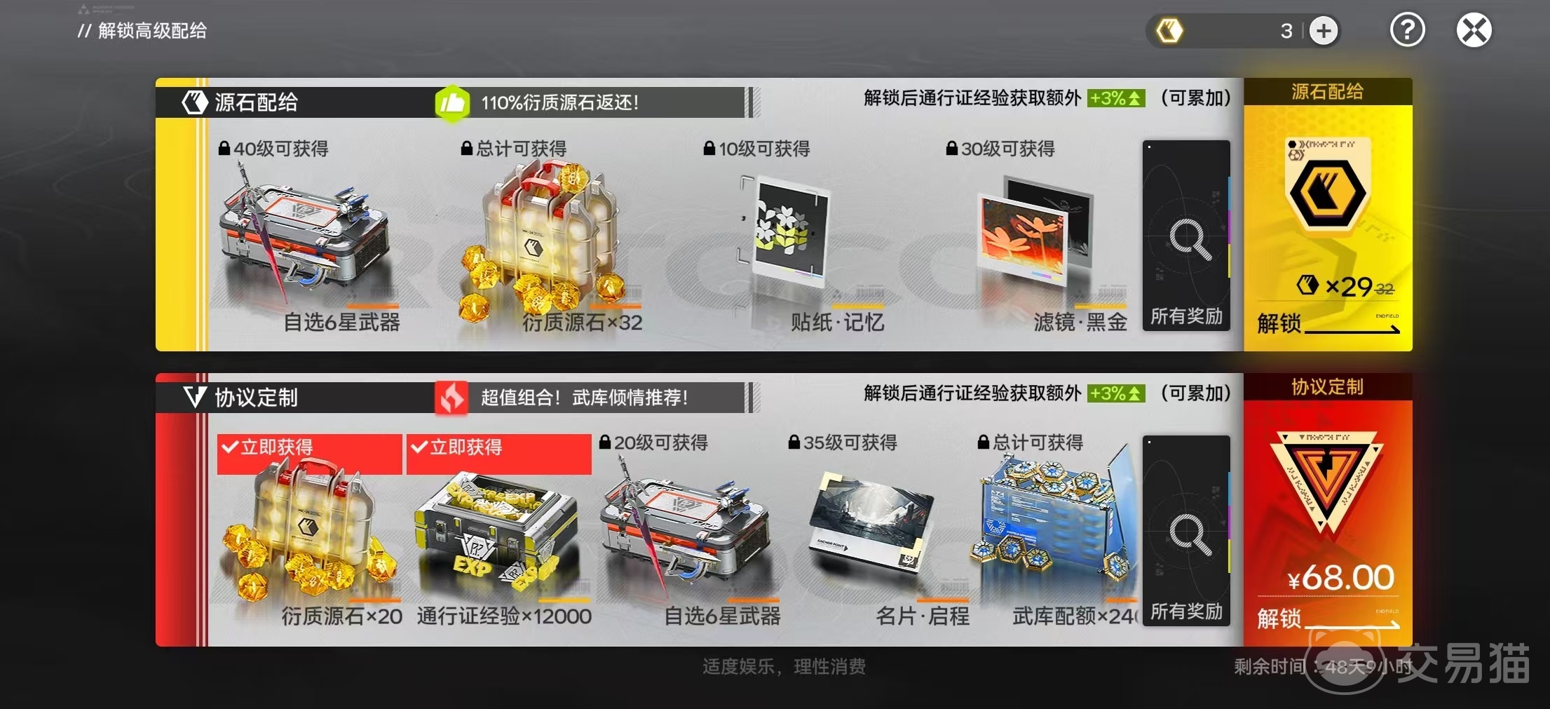 从资源效益最大化角度出发,推荐优先达成29枚衍质源石的储备目标,用于立即激活通行证中的“原石配给”模块。该模块生效后,可获得110%的原石返还加成,实质相当于以零成本持续获取各类成长资源;后续升级还可领取自选武器箱、主题贴纸及场景滤镜等限定外观道具。完成此项解锁后,剩余衍质源石再统一兑换为嵌金玉,集中投入关键卡池提升干员抽取效率。