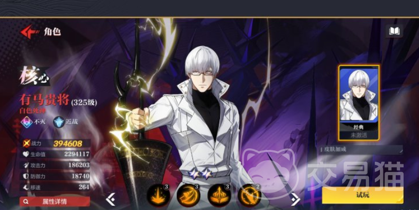第三位推荐角色是有马贵将,同属不灭阵营,以高机动近战与持续压制见长。其位移技能支持快速绕后切入,攻击命中后有概率将自身负面状态转移至目标,实现类似净化的战术反制效果。大招【落雷】不仅拥有高倍率范围伤害,命中后还可按比例恢复自身生命值,配合其被动减伤与能量回复机制,显著强化其战场存活率与续航稳定性,使其在持久战中始终维持高强度输出与干扰能力。