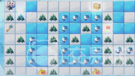 雪场活动不仅提供鲜牛奶与铃铛两类基础道具,还能逐步解锁后续奖励节点,整体节奏友好、投入产出比高。但需特别注意:角色在无遮挡冰面上会持续滑行,直至碰撞障碍物(如树木)才停止。因此每一步移动前都应预判终点位置。初期关卡地形规整,推荐采用“右→下→左→上”顺时针路径,可完整拾取全部奶瓶,并精准停驻终点,新手一次通过率极高。随着关卡递进,地图扩展为标准网格结构,策略调整为“先右后左、由外向内”——优先清理右侧所有奶瓶,再开启宝箱;随后转向左侧区域,切忌直冲终点,避免遗漏关键目标。