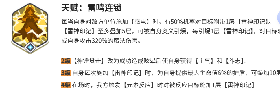 索尔的核心战斗逻辑围绕“雷神印记”展开,该机制深度绑定“雷鸣连锁”天赋。每当索尔对敌人施加感电状态时,有50%概率为其附加1层雷神印记,上限为5层。当索尔释放奥义技能时,所有已叠加的印记将同步引爆,对目标及其周围单位造成总计320%的魔法伤害。这种高密度AOE输出可快速瓦解敌方阵型。随着天赋等级提升,索尔的基础生存能力同步增强:满级后额外获得8%最大生命值与320点闪避属性。