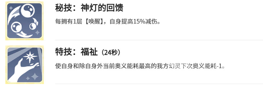 “神灯的回馈”赋予角色防御反哺能力:每拥有1层唤醒,即可获得15%伤害减免,多层叠加形成可观生存缓冲,有效延长其在前排或中排的站场时间。“福祉”特技冷却24秒,可降低自身下一次奥义的能量消耗,并允许指定一名奥义能耗较高的队友同步降低其奥义消耗,加快全队奥义节奏,支撑连续战术衔接。“神格愿力·神盾”则提供治疗后护盾机制——当目标经治疗恢复至满生命值时,额外为其附加相当于祈愿神灯自身最大生命值15%的护盾,进一步提升治疗的安全边际与续航稳定性。