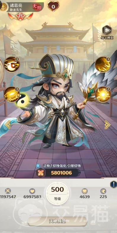 诸葛亮:六星路径清晰,机制深度突出策略延展性。其扇击技能对全体造成92%法术伤害,并对已处于【混沌侵蚀】状态的目标触发暴击(20%概率);同时有35%概率为随机敌方追加【混沌侵蚀】层数;进入战斗即永久提升9%全伤害;回合行动结束后,按自身4.5%最大生命值进行自我回复;另可对一名随机敌方发动基于诸葛亮当前生命值4.5%的真实伤害,实现“以血换伤”的反制逻辑。