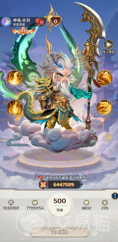 神祇关羽:作为关羽进阶路线中的顶级形态,该版本突破常规物理输出框架,构建起“护盾穿透—真实增伤—状态压制”三位一体的爆发体系。普攻技能以青龙偃月刀为媒介,对全体敌人造成97%物理伤害;若目标存在护盾,则优先触发相当于其护盾值50%的真实伤害;对带有煌龙烙印的目标,额外附加20%攻击值的真实伤害;并有20%概率施加【神罚】——使敌方单位攻击失准,且治疗与受治疗效果归零。当激活武圣觉醒状态后,技能升格为“刀镇山河”,伤害提升至106%,护盾真实伤害比例翻倍至100%,全体额外真实伤害固定为20%,【神罚】触发率调整为15%,持续压制敌方输出与续航能力。