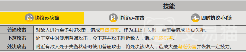 天赋系统进一步强化其体系适配能力:「歼灭协议」随等级提升,对处于失衡状态的敌人额外造成20%至30%伤害,使其天然契合失衡流派的主C定位;「循环协议」则赋予连携技能在命中破防目标后额外弹射一次的特性,大幅提升技能覆盖率与技力转化效率,在面对密集编队或机动集群时展现出极强的战术延展性。技能组覆盖单体爆发与群体压制双维度——召唤类技能可自空中降下大范围电磁冲击,同步附加电子附着效果,兼顾伤害、控制与持续压制。
