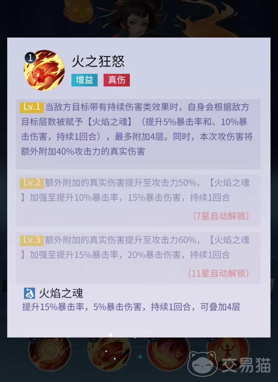 二技能具备状态响应机制:若敌方单位已存在任意持续伤害类效果(包括灼烧、净火、流血等不同名称的DOT),则根据其当前层数为本次攻击附加“火焰之魂”。每层提升5%暴击率与15%暴击伤害,最多叠加4层;同时该次攻击还将额外附加真实伤害。该机制不局限于红孩儿自身施加的灼烧,队友所触发的各类持续伤害均可激活,从而实现稳定增益。