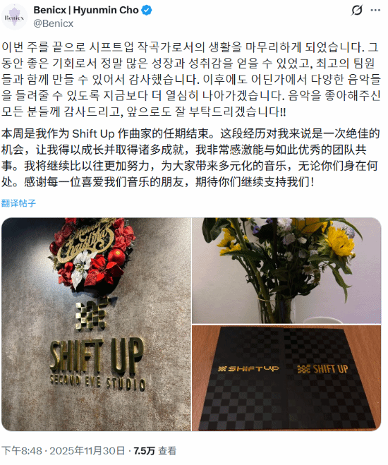 韩国开发商Shift Up旗下知名作曲家Benicx于近日宣布离职,他曾为《剑星》及《胜利女神:新的希望》创作多首乐曲。这已是该公司近一年来第二位核心作曲家离任。