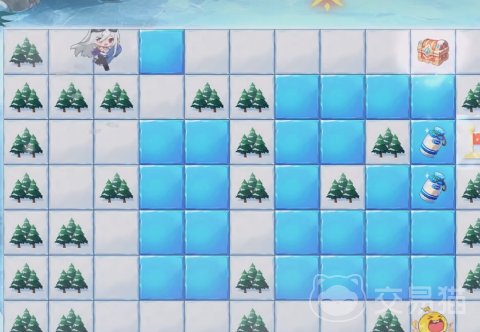 本关结构呈回环式设计,共分三段核心动线。第一阶段:右移7步,在宝箱前一格停驻,随后下→右→左→下→右→上→右→下,绕过首只史莱姆;第二阶段:继续下→右→下→左→下→下→右→上→左,抵达左侧钥匙点并拾取;第三阶段:返回起点后不重置,右移直抵宝箱开启,再右移一格后下移到底,途中驱散右侧史莱姆以打通通路;随后下移一格→左移到底→上移→左移→上移,沿途收集全部牛奶道具,全程规避史莱姆;最后从右侧迂回下行,左移一格避开史莱姆,下行开启最终宝箱。若需达成高效通关,可在重置后执行精简路径:右移至宝箱前一格→下→右→下→驱散史莱姆→沿右侧行进到底即通关。