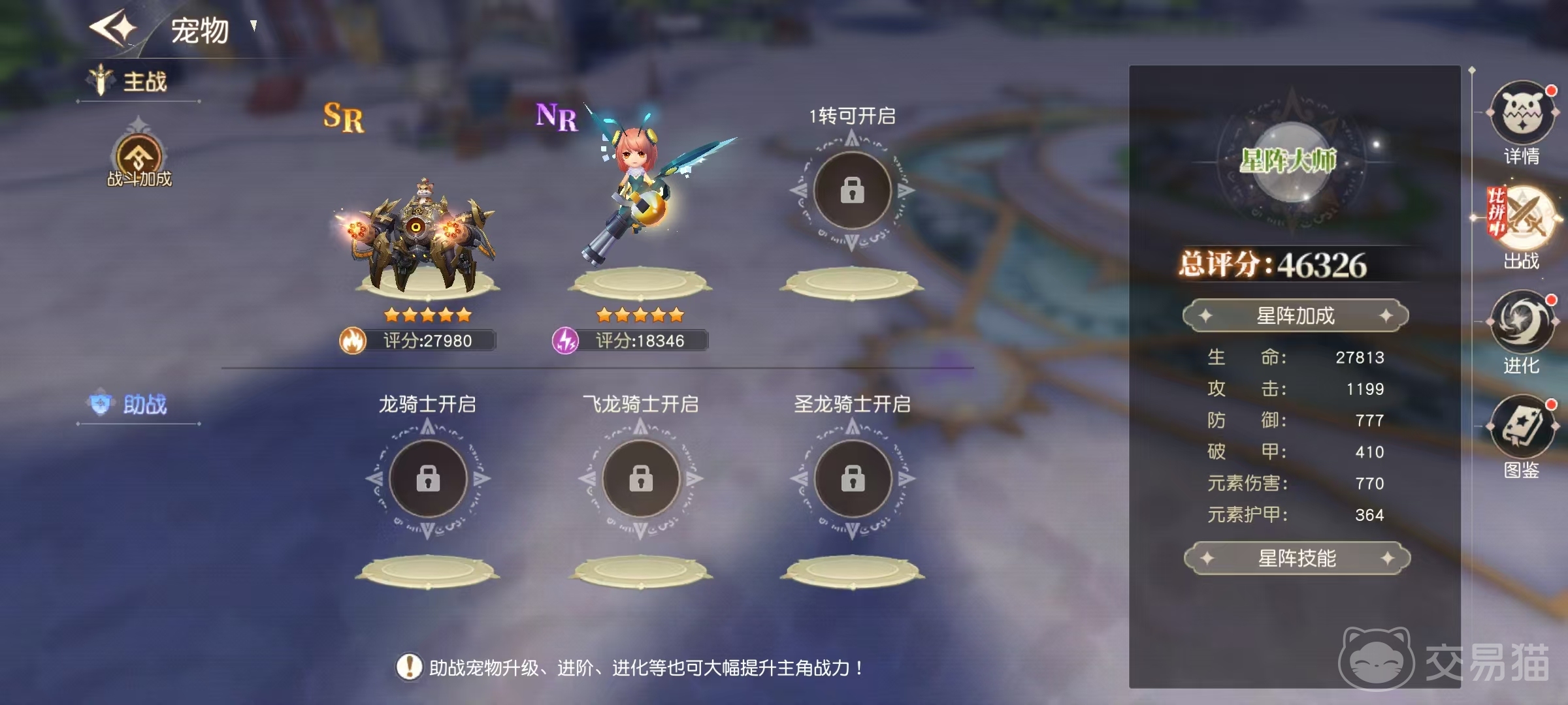 第三,进化:当满足前置条件后,可启动进化流程。进化生效后,宠物将获得额外成长率加成,并同步提升主动技能与专属技能的等级上限,进一步释放战斗潜能。 完成养成的宠物需配置至战斗编队。随角色等级提升,出战位逐步开放,最终支持最多3只宠物直接参战,另设3个助战位。实战配置建议以属性综合表现最优者担任出战主力,次优者补入助战位,二者协同可实现战力叠加效应。