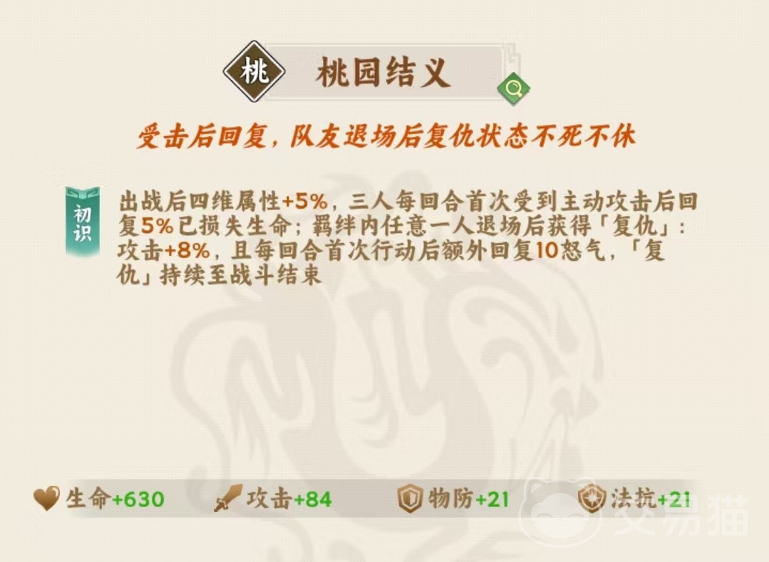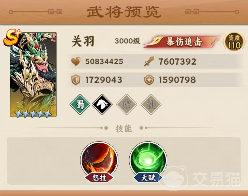 关羽初始资质即达满值110,是全游少数具备双专属羁绊的武将:「五虎上将」与「桃园结义」。其中「五虎上将」为当前唯一五人成型的高阶羁绊,强度处于版本T0梯队,构成阵容上限的关键支点。