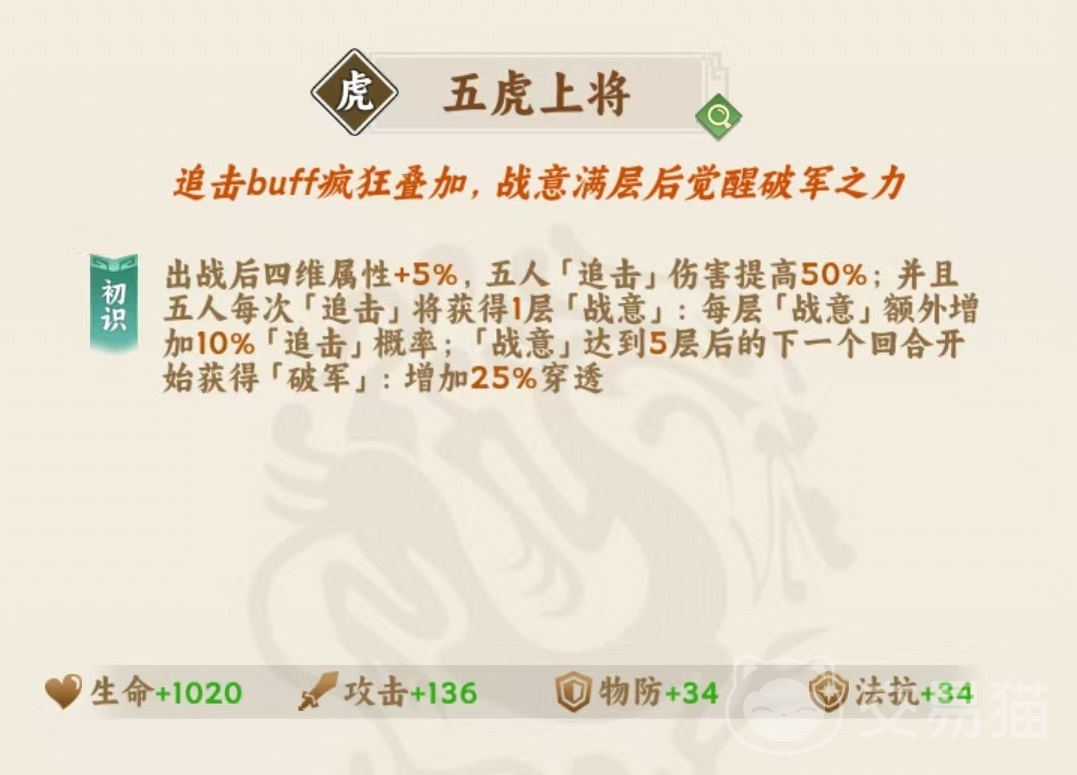 阵容构建上,关羽必须围绕「五虎上将」羁绊展开。该羁绊不仅大幅提升五名成员的追击伤害,更在触发追击时叠加额外效果,进一步提高后续追击概率,形成滚雪球式输出循环。以关羽为核心,搭配张飞、赵云、马超、黄忠组成完整五虎阵,即可稳定激活羁绊。第六位推荐选用刘备——达成「六蜀将」组合后,全队获得10%攻击力与10%生命值双加成;同时刘备具备治疗与护盾类辅助能力,有效补强团队续航容错。其余位置可根据战场局势、英雄池深度及对手阵容灵活调整。