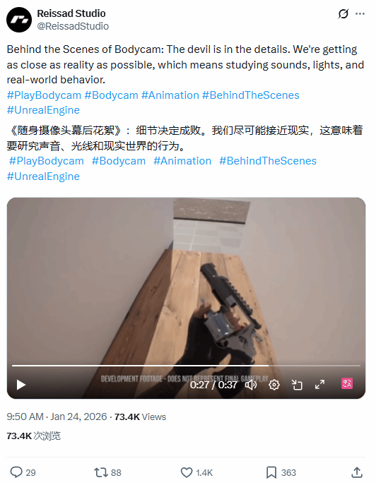 近日,《Bodycam》官方在推特上放出了游戏的全新花絮视频,非常拟真,细节满满,一起来看看游戏的画面表现吧!