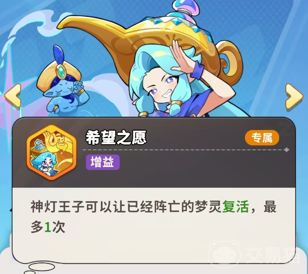 主动技能“灯灵出击”可投射迷雾区域,触发多段范围伤害;而被动“先到先得”则构建了独特的资源联动体系——神灯王子通过普通攻击积攒“愿能”,当其他梦灵进入充能阶段时,将自动消耗其全部愿能,每层愿能提升100%充能效率,上限为四层(即最高400%效率增幅)。这一机制显著压缩技能真空期,使整支队伍输出链更紧凑、更连贯。