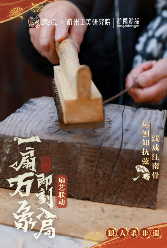 在尝试着将非遗扇艺融入游戏中时,网易狼人杀的游戏团队也来到了工坊,跟随学习赵平加制扇流程,了解每一种工艺背后的文化内涵。从线下到线上,虽然是两种体验,但存在同一种文化内核。狼人杀以这种方式带非遗扇艺完成了一次“破圈”,此刻杭扇已经不再只是文人雅士的藏品,而是能让年轻人“即刻入局”的文化载体。