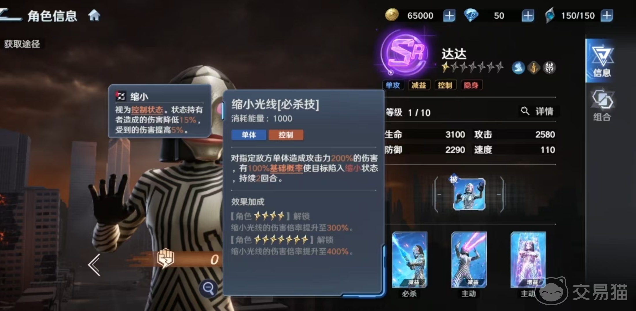 必杀技【缩小光线】对敌方单体造成伤害,并有概率施加持续两回合的“缩小”状态。该状态属于硬控类减益,可显著削弱目标行动效率与输出能力,在对抗高威胁单核敌人时具备明确战略意义。技能等级提升后,基础伤害倍率同步增强。