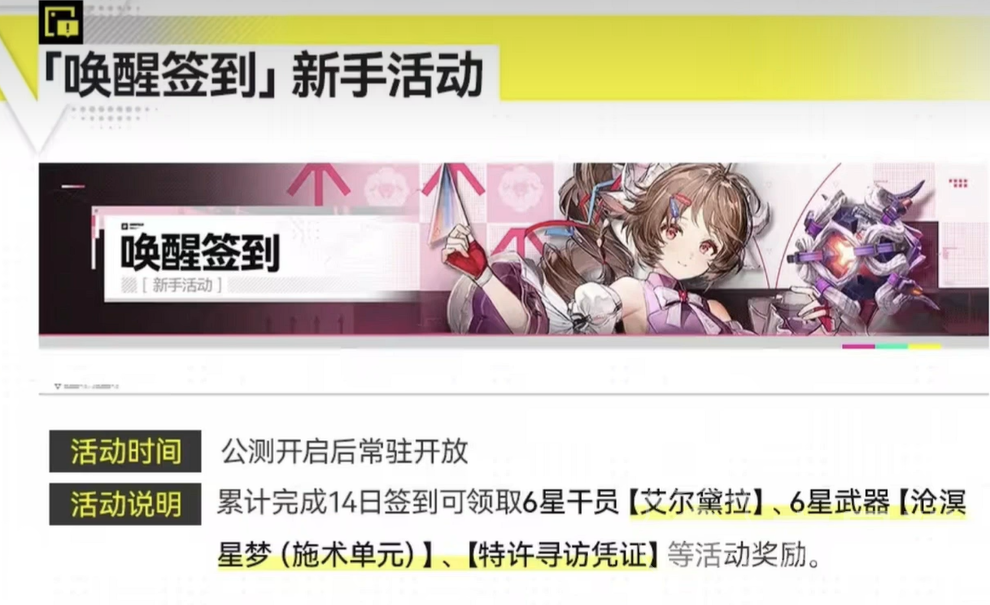 首推“唤醒签到”活动,需完成主线任务解锁活动中心后方可参与。该活动分为两个阶段:前7日每日登录可领取1张特许寻访凭证,总计6张;若持续签到满14日,则额外授予6星干员艾尔黛拉及专属6星武器沧溟星梦(施术单元类型),同时再获6张特许寻访凭证。至此,累计凭证达12张,配合干员与武器的绑定配置,新手指挥官可在两周内快速组建一支具备完整输出链路的高阶作战单元。