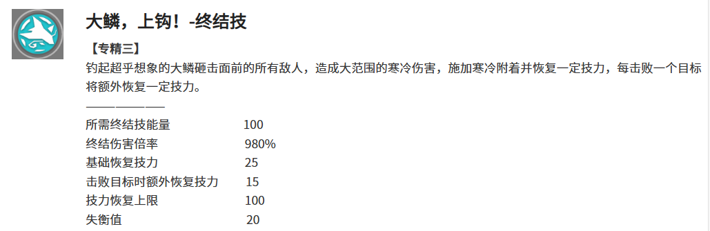 终结技【大鳞上钩】需积攒100点能量释放,造成980%寒冷范围伤害,并为目标施加寒冷附着,基础回复25点技力;每击倒一名敌人额外回复15点技力,上限为100点。该技能不仅承担群体输出职能,更承担关键的技力补给与状态铺垫作用——既通过高覆盖率挂载寒冷附着,为战技提供消耗基础,又借助击倒反馈快速填满技力槽,实现终结技→战技→普攻处决的高效闭环。