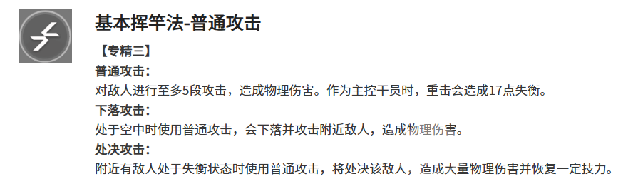 普通攻击方面,阿列什采用五段式物理连击,各段倍率依次为39%、23%、62%、62%、124%,合计总倍率为310%。虽基础输出未达顶尖水准,但其具备关键的“失衡处决”机制——当敌方处于失衡状态时,任意一段普攻均可触发900%倍率的高额伤害,并同步恢复技力。该机制构成其主要爆发来源,对团队失衡辅助能力形成强依赖。下落攻击倍率为180%,重击可施加17点失衡值,为处决创造前置条件。