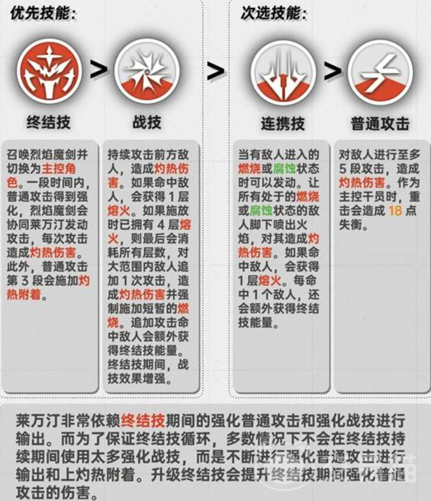 莱万汀的核心机制围绕“熔火层数”构建:其普通攻击与重击可对目标施加灼热附着,并逐层叠加;当主动消耗已积累的熔火层数释放战斗技能时,将触发额外伤害加成。此外,战斗技能与连携技能均具备加速终结技能充能的效果。而其终结技能作为关键爆发手段,开启后不仅大幅提升普攻倍率,还可对大范围敌人造成高额斩杀伤害,兼具AOE清场与单体压制能力。
