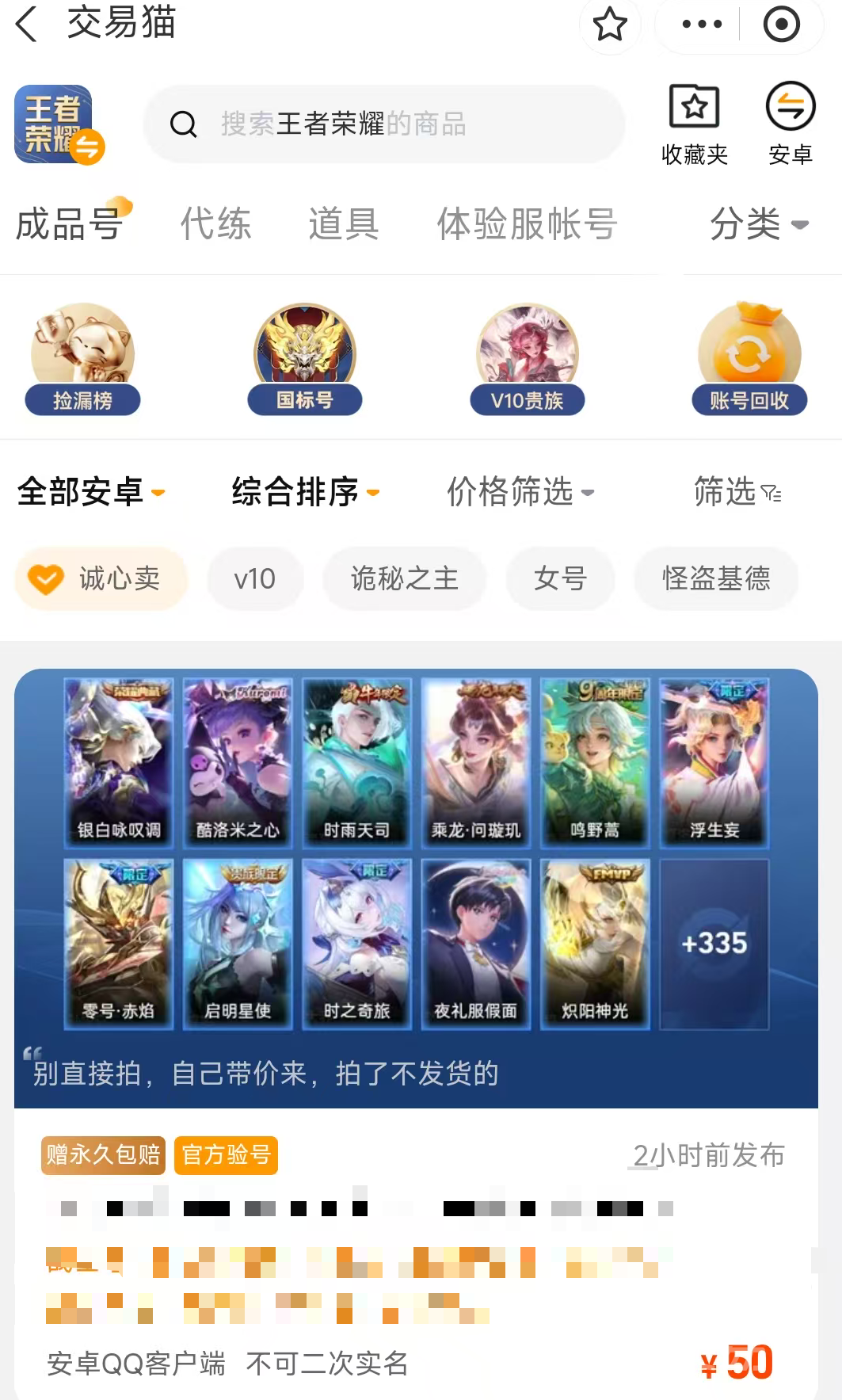 扫码下载APP 下载 点击下载APP很多玩家在购买王者荣耀账号的时候,都会担忧账号的内容是否真实,交易过程中会不会出现病毒等情况,而这些情况在平台是不会出现的,因为平台的多数账号都经过官方的验号,确保了账号的内容真实准确,同时附带了安心购的服务权益,账号有任何的特殊情况,官方会第一时间进行赔付,同时平台已实现全品类游戏覆盖,6000余款热门大作都能精准匹配需求。100万 优质游戏商品实时上架,账号、道具、礼包一应俱全,凭借成熟的服务体系,累计为7000万 玩家提供安心服务,成为游戏爱好者的首选枢纽,要想使用的话安卓用户只需要通过上方按钮下载,ios用户可以到官网使用哦,操作流畅很简单的。