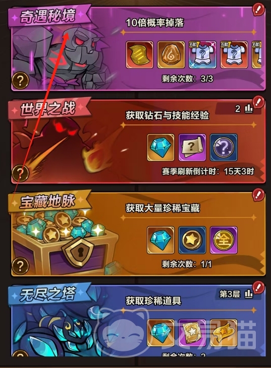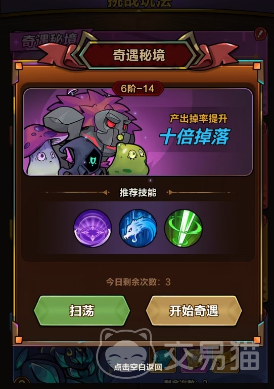 当角色成功通关1阶-5关卡后,历练系统正式解锁,奇遇秘境同步开启。该副本为限时福利型内容,每日提供三次挑战机会,支持一键扫荡,操作便捷。其关卡难度严格对标玩家当前已通关的最高普通关卡——例如,若玩家当前最高通关记录为3阶-15,则奇遇秘境对应难度即为3阶-15,但所有掉落物品的基础爆率提升至原关卡的10倍。这意味着高品质装备(尤其是太古、远古品质)的获取效率显著提高,是稳定积累核心战力装备的关键途径。务必确保每日三次挑战全部完成,避免资源浪费。