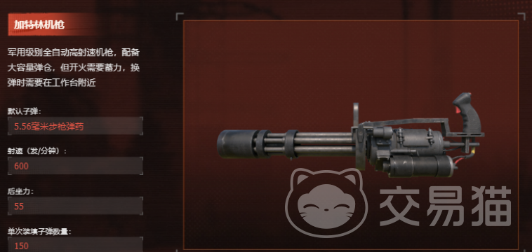 多管旋转式全自动机枪,拥有大容量弹匣与高持续输出能力,后坐力控制表现良好。但存在明显使用限制:开火前需完成蓄力准备阶段;弹药耗尽后必须返回工作台进行装填操作。该机制使其更适合固定据点防守或预设伏击场景,而非机动性要求高的动态对抗。