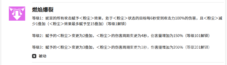 「燃焰爆裂」是妮亚构建战斗节奏的基础技能,专用于快速铺叠粉尘状态。处于粉尘影响下的敌人,每秒承受相当于妮亚100%攻击力的真实伤害;粉尘层数可叠加至4–5层,且单层消退后能迅速再叠,确保全程覆盖率。掌握该技能的释放时机,是激活全技能链式增益的前提。