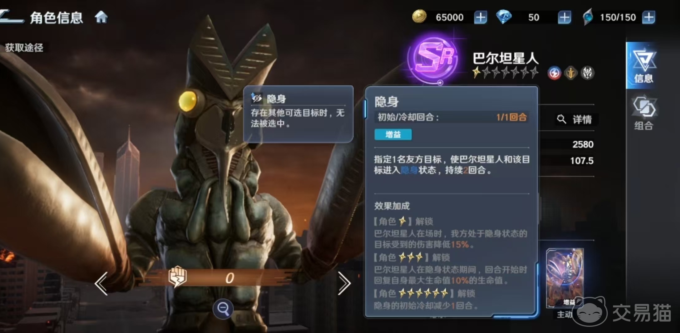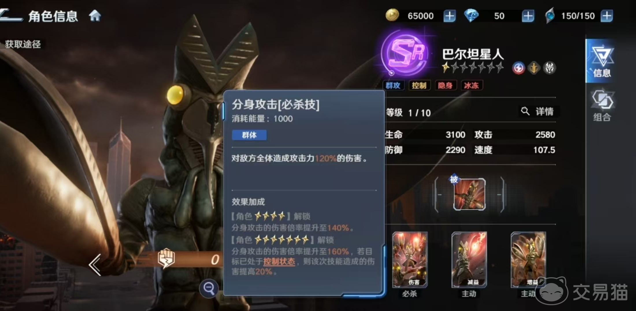 其被动技能“隐匿庇护”生效时,我方所有处于隐身状态的单位所受伤害降低15%;必杀技“分身突袭”对敌方全体造成120%攻击力的伤害,升星后倍率提升至160%,若目标当前处于控制状态,则额外触发增伤效果;主动技能“红色冻结光线”针对单体目标施加伤害,并有概率令其陷入冰冻,最高触发概率随星级提升至35%,冰冻状态下目标将跳过一回合行动;专属技能“战术隐身”可指定一名友方单位,使巴尔坦星人与其共同进入隐身状态,持续两回合,隐身期间无法被敌方选中,升星后进一步降低隐身单位所受伤害。