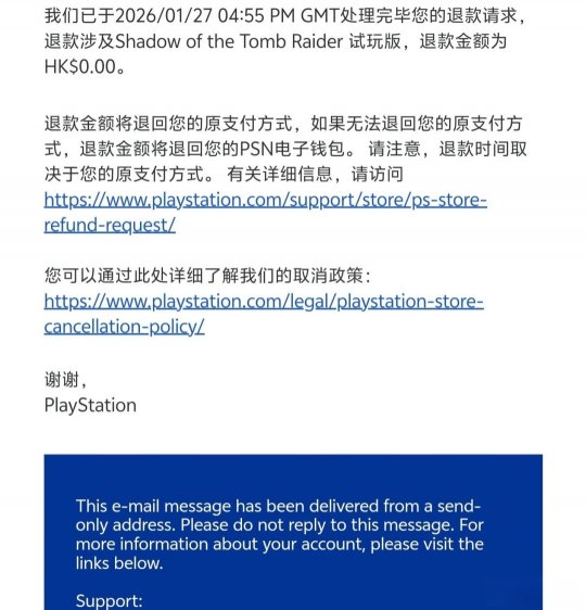 尽管漏洞存在时间不长,但已有相当数量的玩家借此获得了游戏。在漏洞修复后,索尼并未立即收回已领取的游戏副本。直至近期,索尼开始正式处理此次异常领取事件。官方采取了向相关账户发放0元退款通知的操作,并同步移除了这些账户对该游戏的所有权。这意味着通过该漏洞获取游戏的玩家,其游戏库中的《古墓丽影:暗影》现已被移除,无法再继续下载或游玩。
