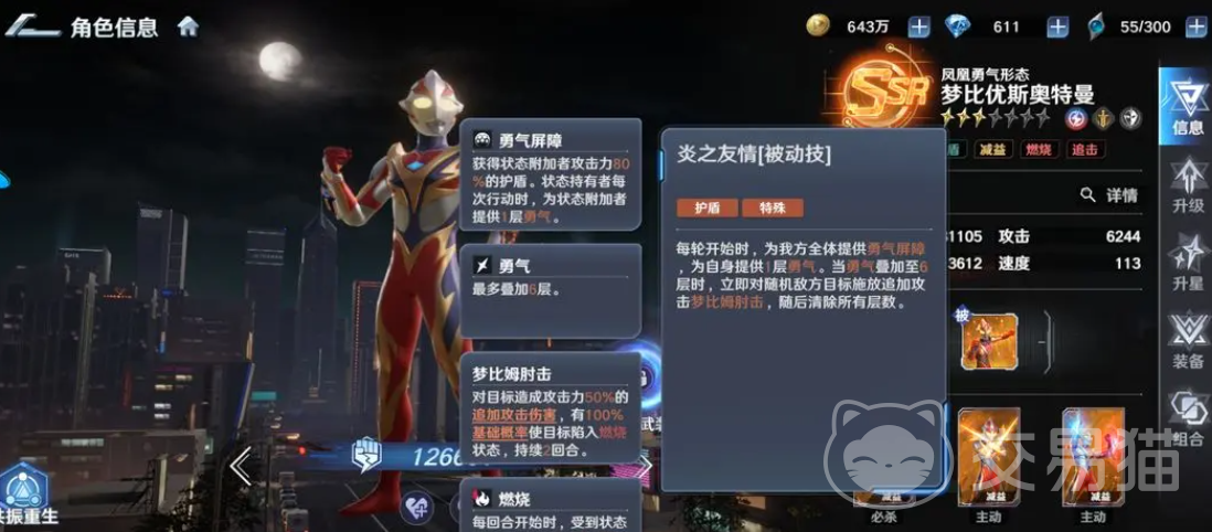 在银河星域的宏大叙事中,梦比优斯奥特曼进化为光之战士凤凰勇者,象征信念淬炼后的终极形态。这一角色并非单纯的力量化身,而是以勇气为内核、以灼烧为脉络、以协同增益为战术支点的策略型核心。玩家需深入理解其三层机制——勇气层数积累逻辑、凤凰标记触发条件、以及炎之友情被动的能量循环体系,方能在高难度副本与BOSS战中建立稳定输出节奏与团队生存保障。