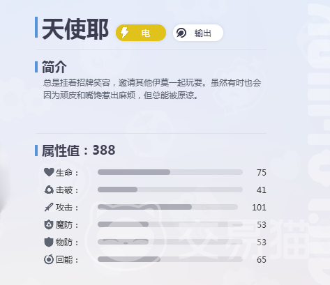 天使耶的基础面板具备显著的均衡性:总属性达388,在同等级角色中处于前列;75点生命值保障其战场生存下限;41点击破属性赋予其有效压制高防御目标的能力;101点攻击值构成主要输出根基;53点物理防护与对应数值的魔法防护形成双维抗压结构;65点回能效率支撑高频技能循环。此外,“电能激荡”被动可提升12%原属性伤害,“雷翼姿态”则通过普攻与命中累计契约层数,满30层后即时触发专属效果,实现攻防节奏的自主调控。