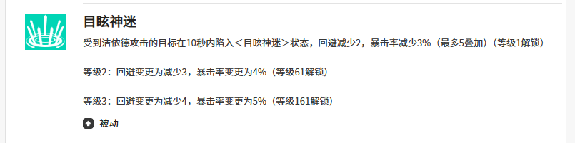 辅助技能“宝石子弹”同样以敌方输出最高者为优先目标,基础造成200%攻击力伤害。当目标已拥有5层“目眩神迷”时,该技能将追加一次范围打击——对3.5米内所有敌人造成120%攻击力的额外伤害,并附加2秒眩晕。相较其他技能,该效果触发条件更易达成,且眩晕可有效衔接后续控制链,强化整体节奏掌控力。其被动效果“目眩神迷”可持续影响目标10秒,每层使目标回避值降低2点、暴击率降低3%,最高可叠加5层,大幅削弱敌方反击概率与生存稳定性。