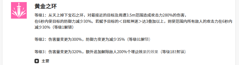 她的首个主动技能“黄金之环”,可在施放后于自身周围3.5米范围内落下宝石环特效,对范围内的敌人造成280%攻击力的初始伤害;随后在6秒内降低目标30%防御力。当该效果成功叠至三层时,将额外使范围内所有敌人的攻击力下降30%,该削弱效果同样持续6秒。