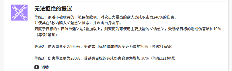 第二技能“无法拒绝的提议”锁定当前敌方攻击力最高的单位,造成240%攻击力的单体伤害,并附加持续6秒的“魅惑”减益。若目标身上“目眩神迷”层数达到两层或以上,该技能将触发机制变更:所有主动技能造成的伤害提升10%,形成稳定的伤害增幅循环。